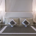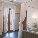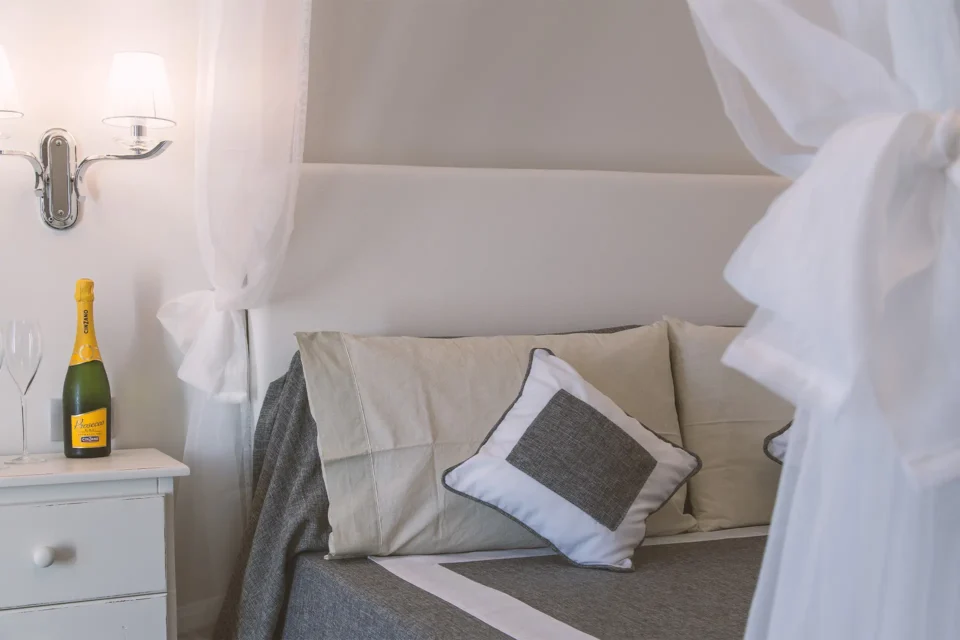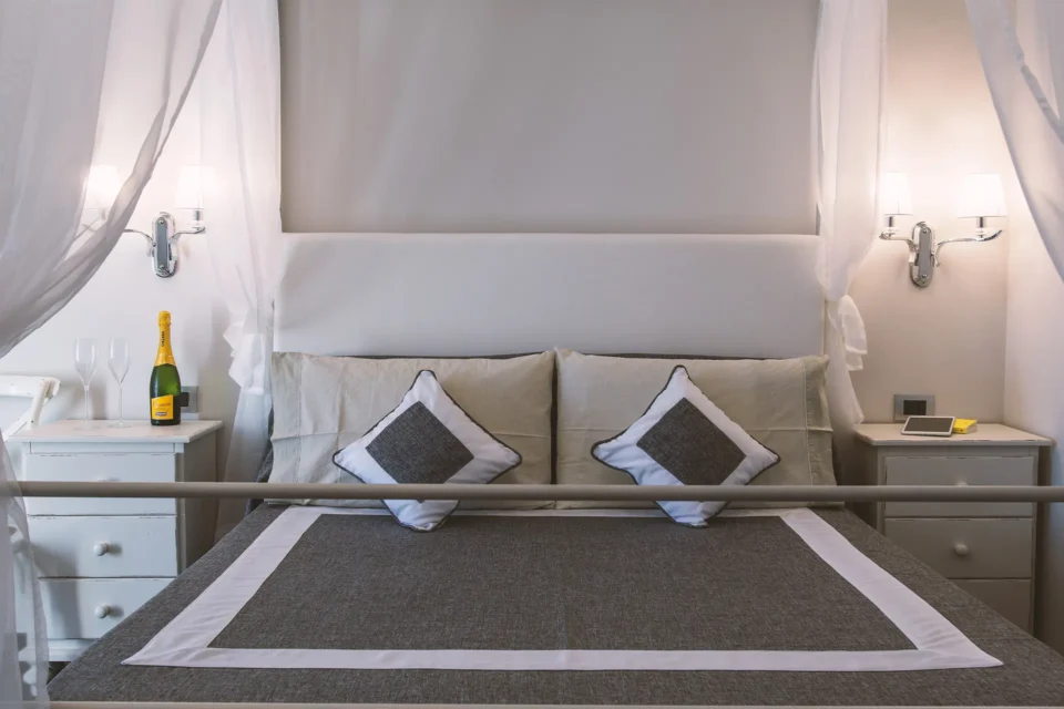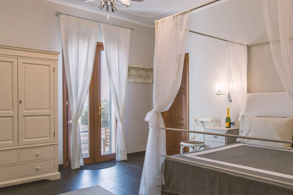 Il bianco ed il nero sono i colori prevalenti di questa junior suite dotata di un letto a baldacchino. Il bagno è piastrellato con pietra lavica e fornito di vasca con idromassaggio.