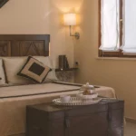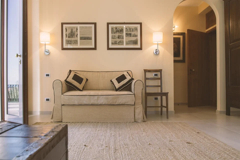 Le aperture che danno verso l’esterno si affacciano sul paese. È la junior suite più ampia di Villa Augusta.